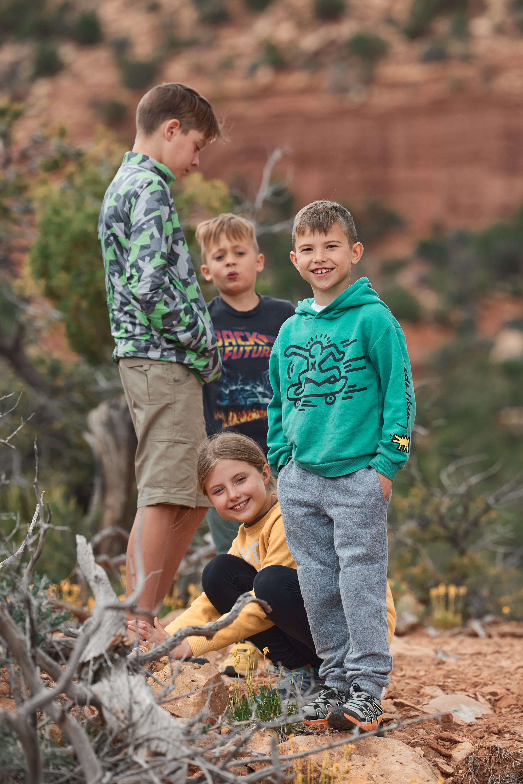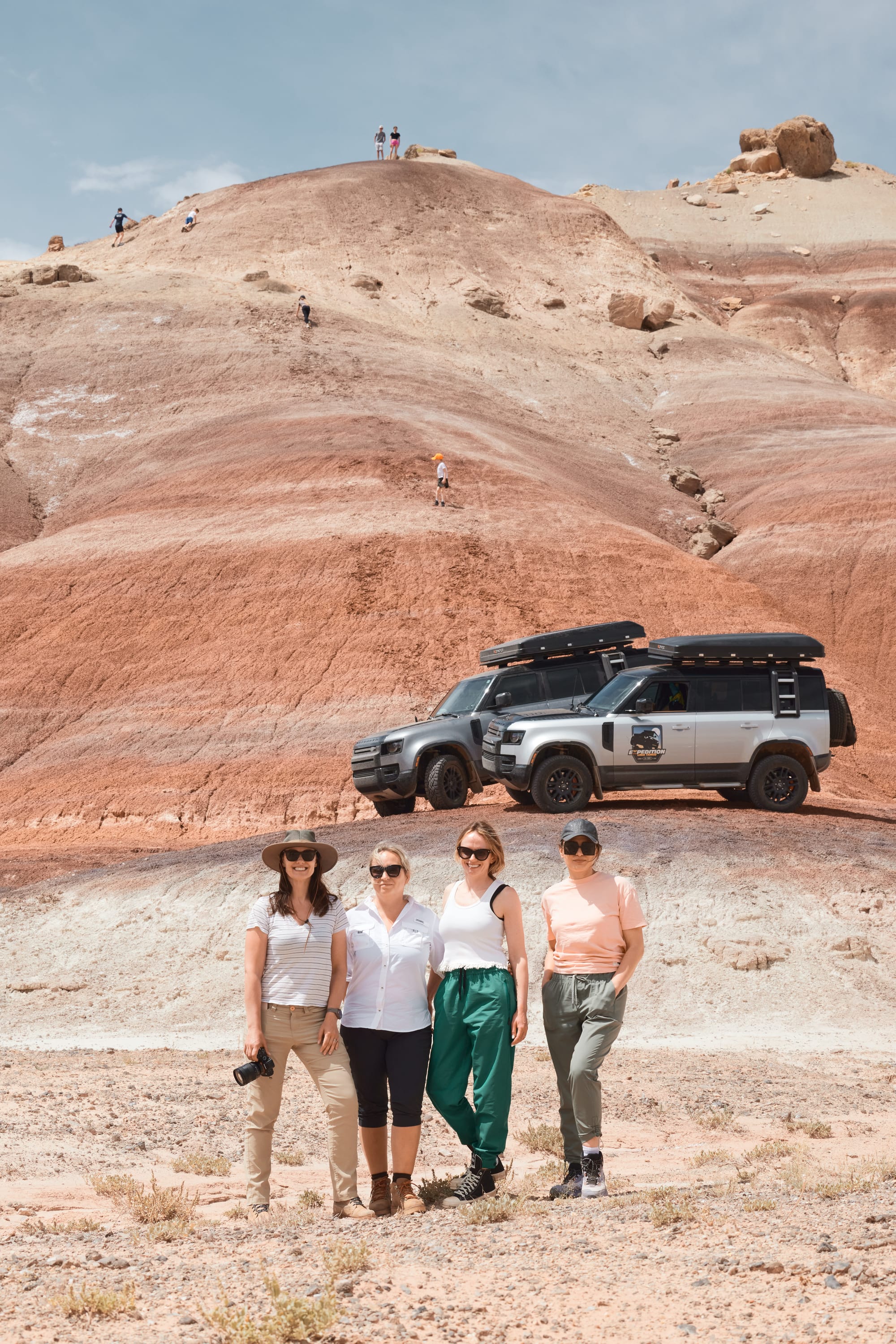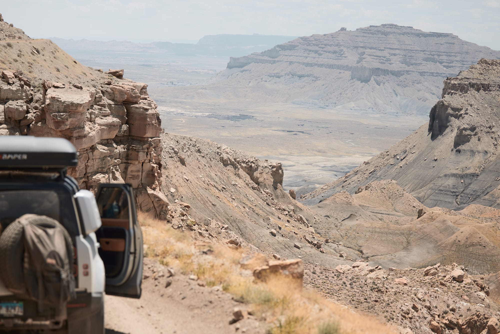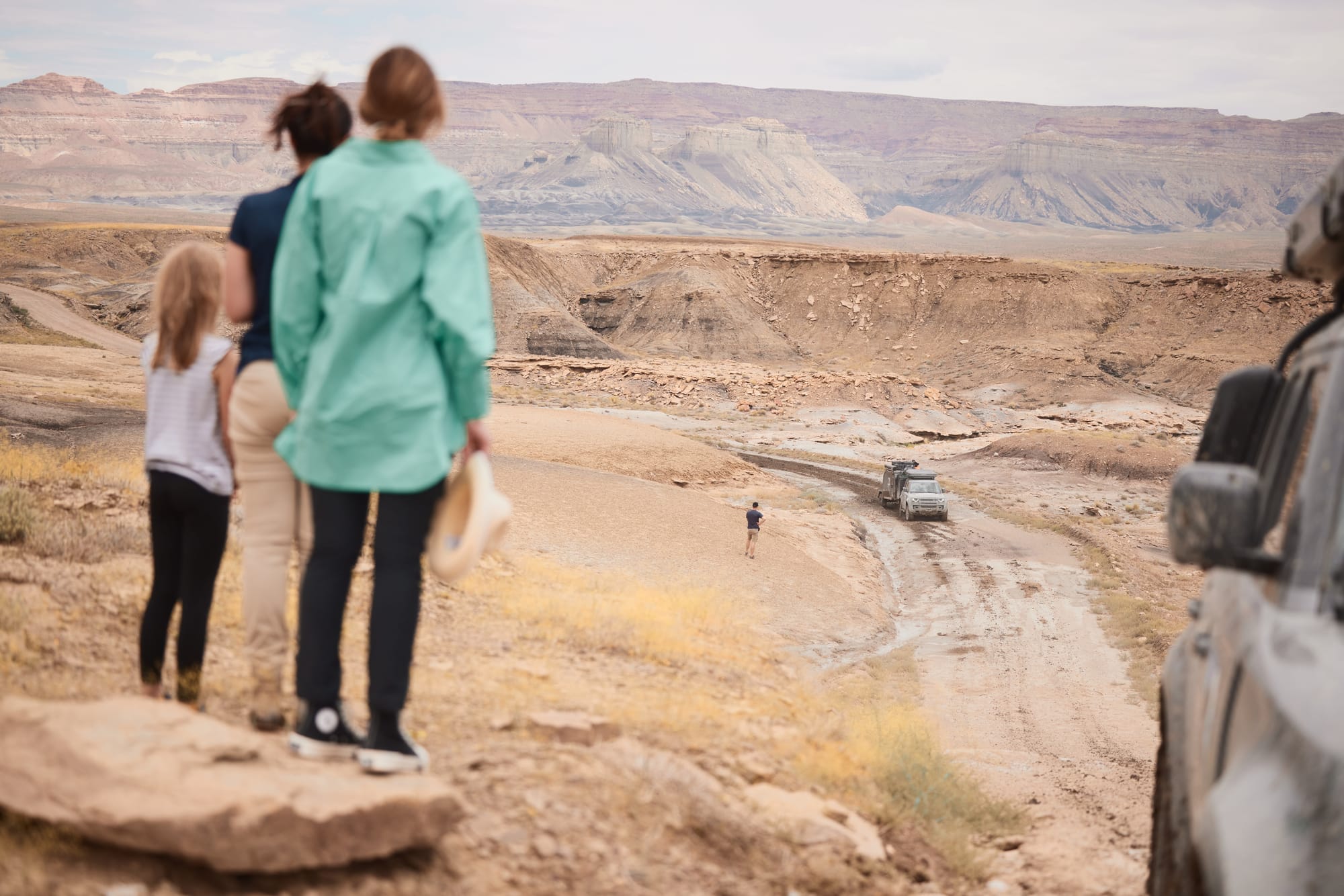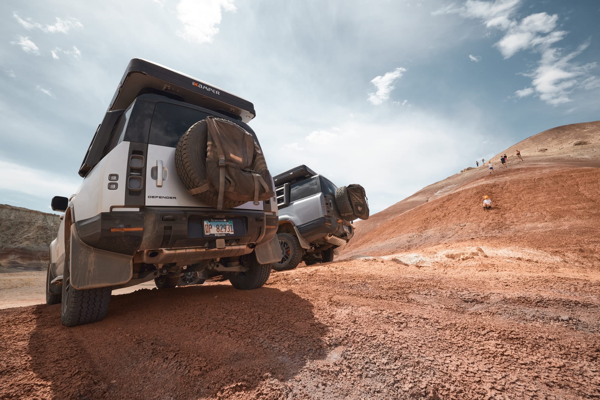 This is my third time overlanding in Utah and I still get awestruck at how rapidly our surroundings shift from dense green underbrush, to sandy hills, to saturated and jagged red crags that would fit better on Mars than on Earth. Our pace is slower today and we explore a few trails on our way that are surrounded by surreal, colorful, and layered hills that managed to somehow escape a Picasso painting. The hills look solid enough for our boyish stupidity to overtake and attempt a few questionable climbs in the Defenders. As soon as kids spill out of the cars we see patches of color scrambling up the surrounding hills, interrupted by concerned instructions from moms below, hands shielding their eyes. The vehicles are staged for a rapid photoshoot and then we're packed in again and on the way to Escalante.