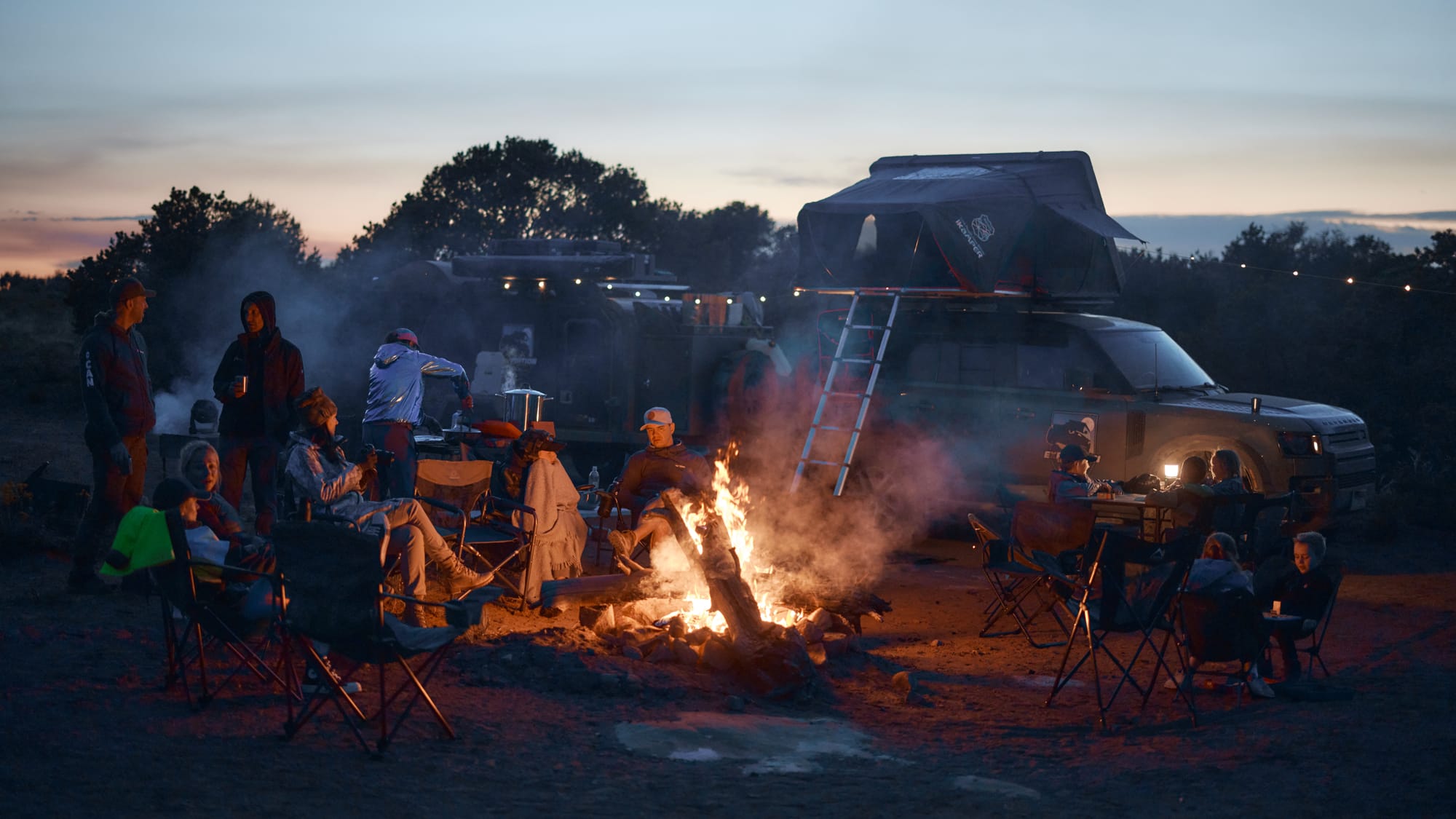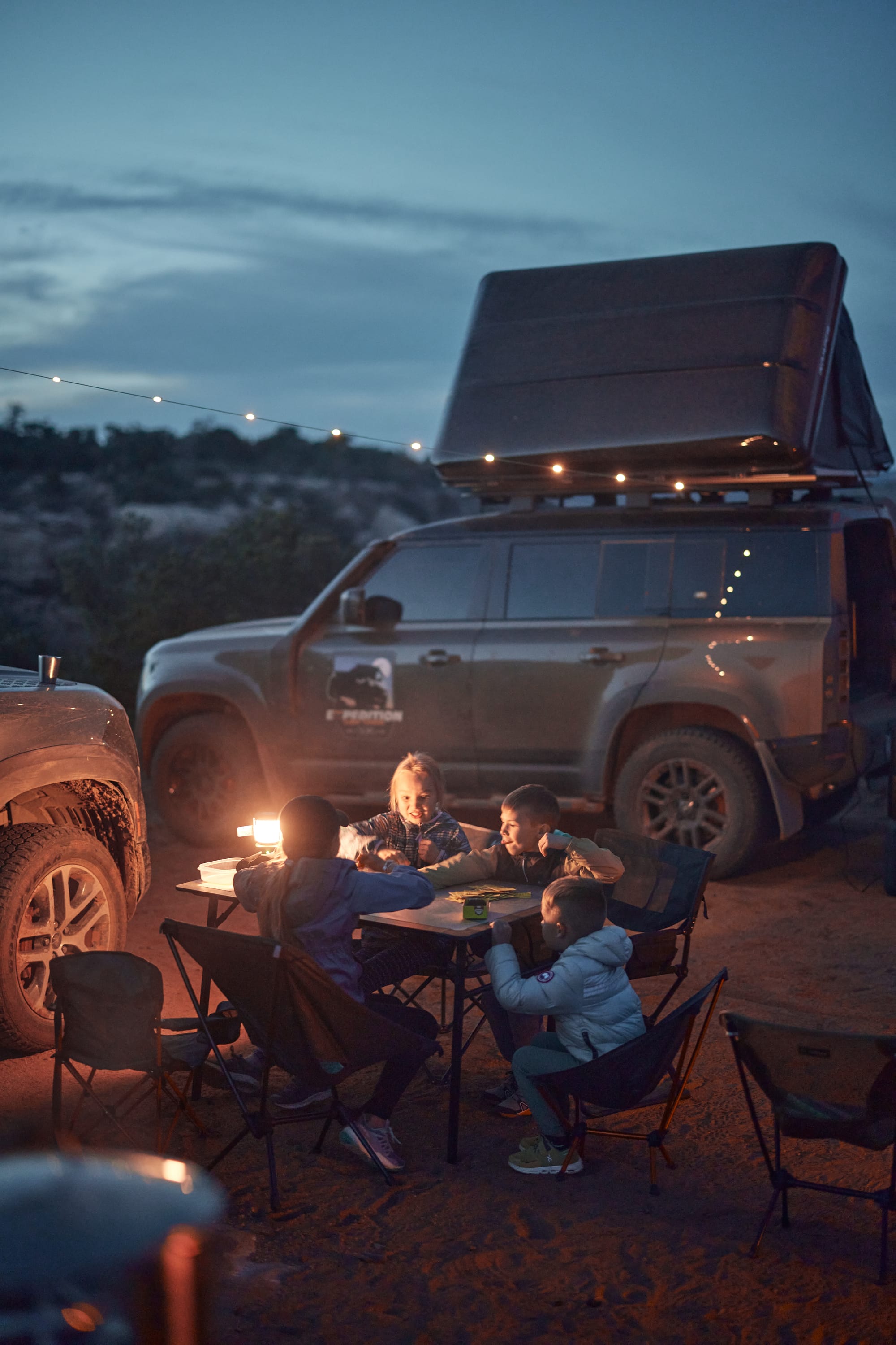 Wide open dispersed sites are the best. We park the trucks in a semi-circle and string camp lights between the roof racks – the Lucie string lights are good for over 8 hours on low output and have a solar recharge panel to get them going the next day. We're situated next to a deprecated landing strip which, we're guessing, was used by rangers a long time ago to maintain the BLM lands in the area. Dark Canyon is a remote site – a minimum of three hours in any direction to get off the dirt. I haul a few dead logs into the firepit and the resulting inferno licks the sky and illuminates our camp. Chairs are timidly pulled away from the hissing and popping fire, cold libations are sloshing in our cups, and the mobile kitchen spits out fragrant puffs of smoke as dinner is prepared for a party of eighteen.