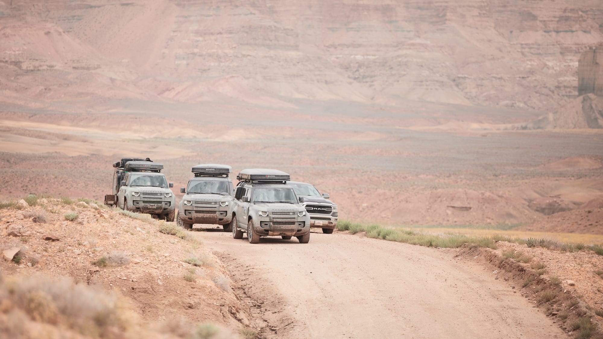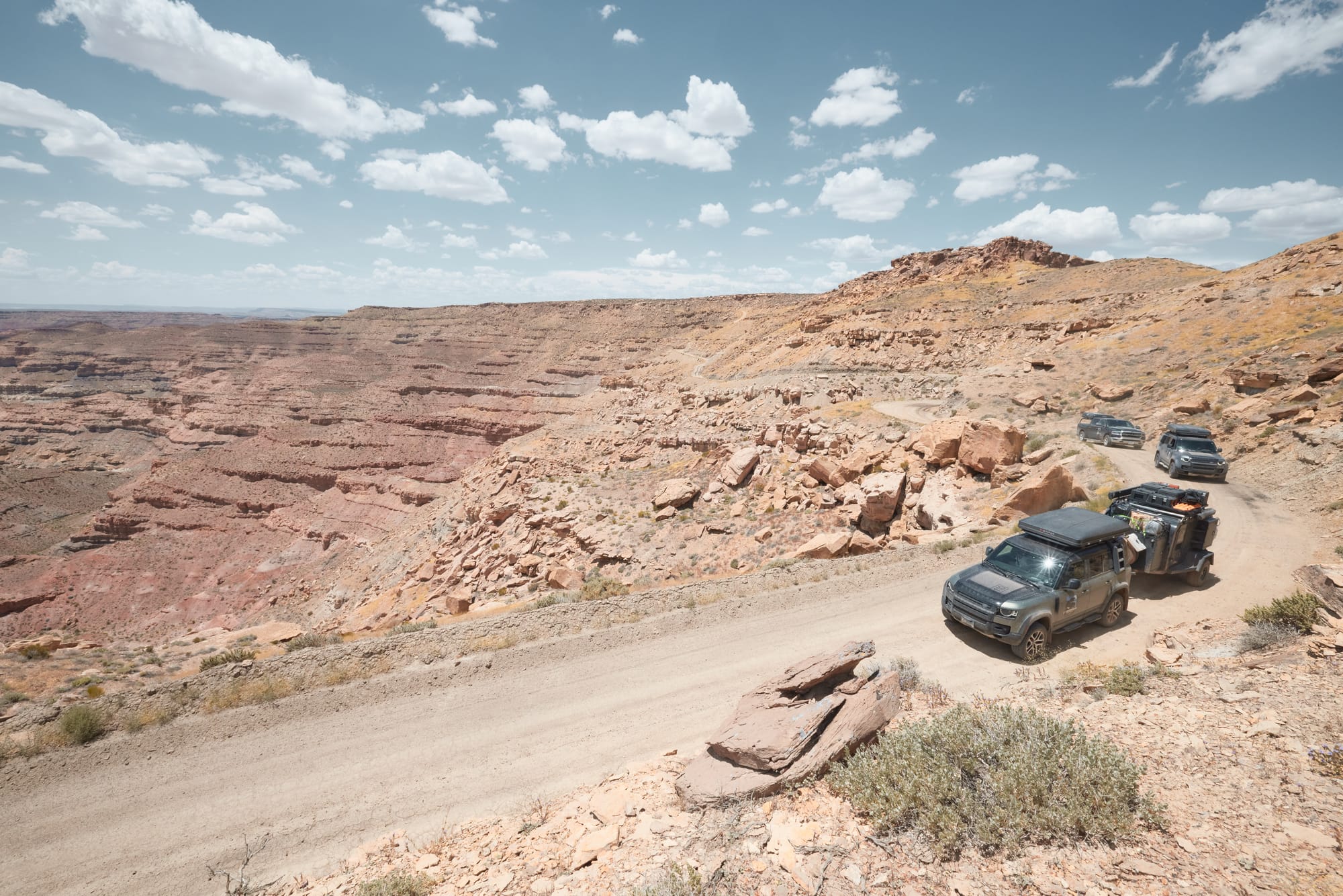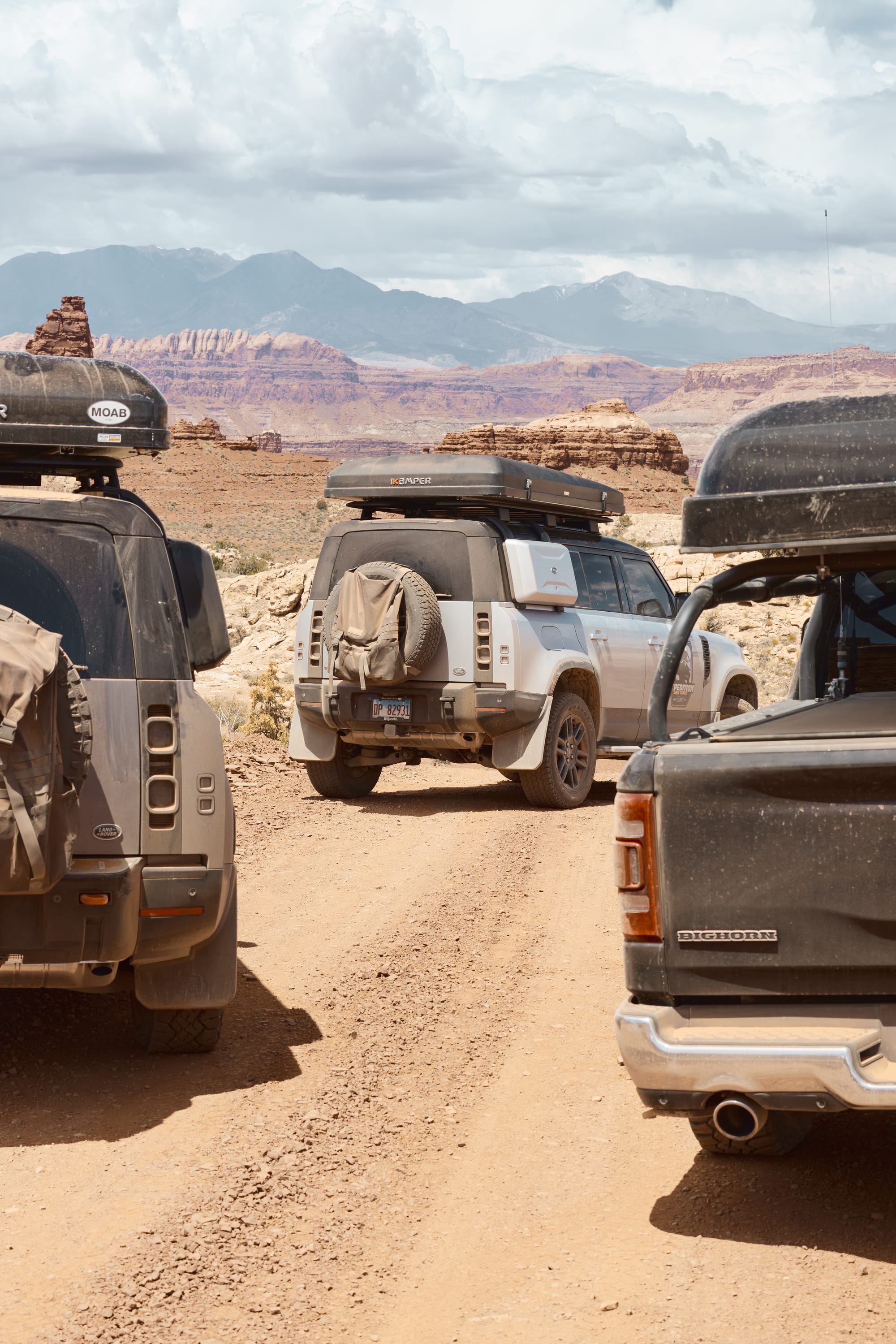 I don't typically associate cinnamon with taking a bruising – misleading name for a trail to say the least. We're down a tire and Martin's Defender is incompatible with any of the other trucks in the convoy (early Defenders did not have break clearance for smaller wheels). If his multi-ton monstrosity cuts another rubber, we're going to be properly stuck. Originally, we intended to make the transfer West using Rimrocker, a 160-mile easy trail, and arrive at Moab, but I read online that there was a chance of flooding. All variables in mind, we decide to take a half day for recovery operations – drive to Moab as fast as we can on civilized roads, repair or replace Martin's tire, refill water and supplies, and then jump back on a familiar trail that leads to our favorite dispersed camping locations in Utah, known as the "airport".