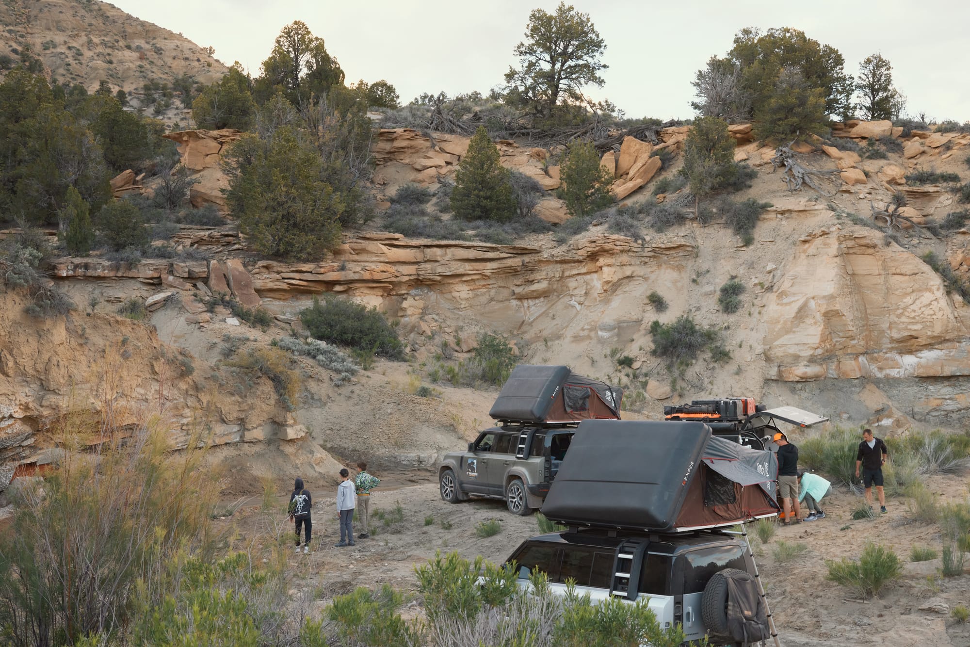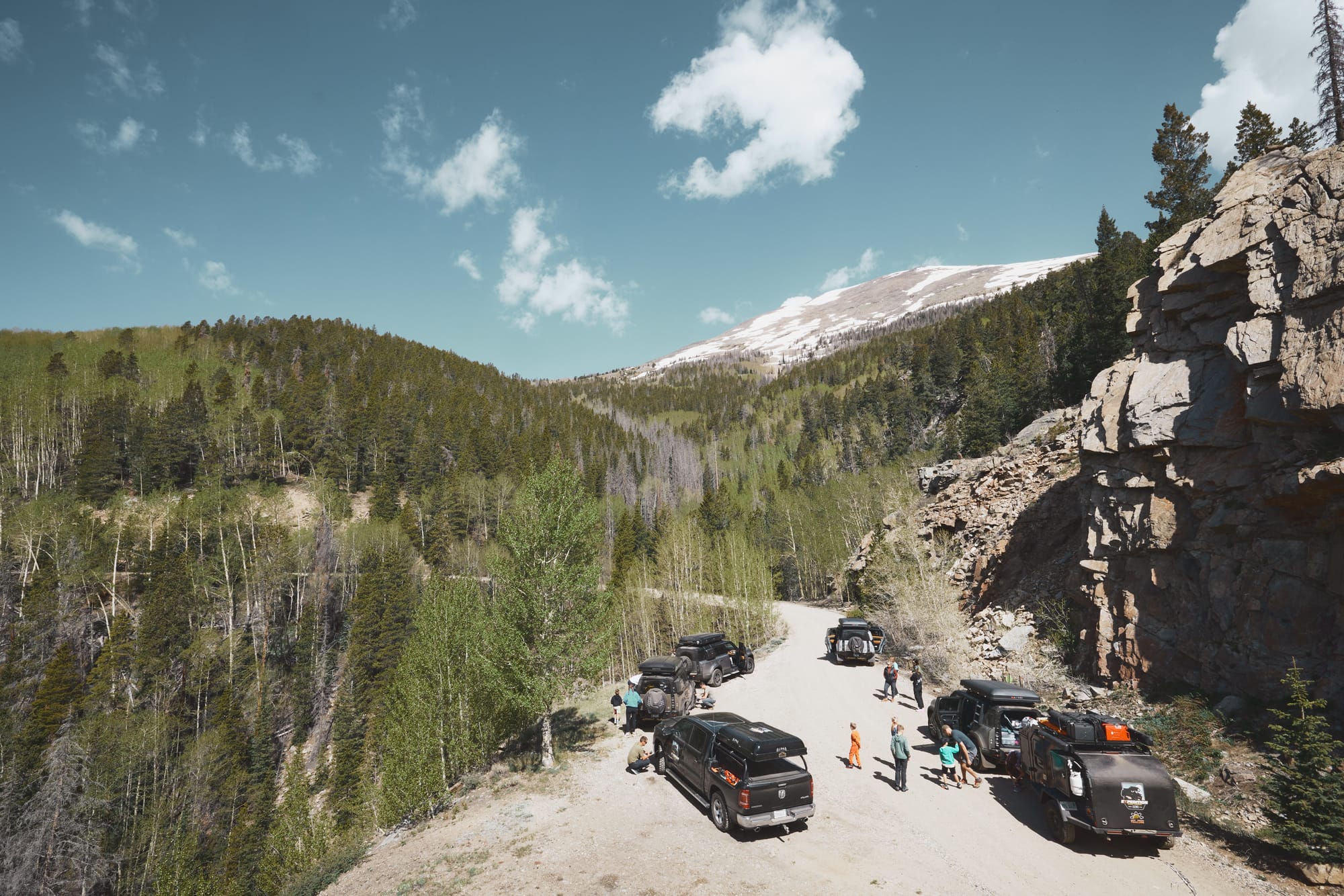 Relief is palpable as we crest the next hill and park our rides at the point of highest elevation on the pass. The narrow trails branch and expand into dull peaks of the Rockies where groups of cars are taking a breather and snapping pictures of the surrounding landscape. As kids scramble up the nearest peak, we dig up a bottle of champagne from our overengineered electric coolers and gulp down the bubbly. Gusts of icy wind remind us this is a temporary respite.