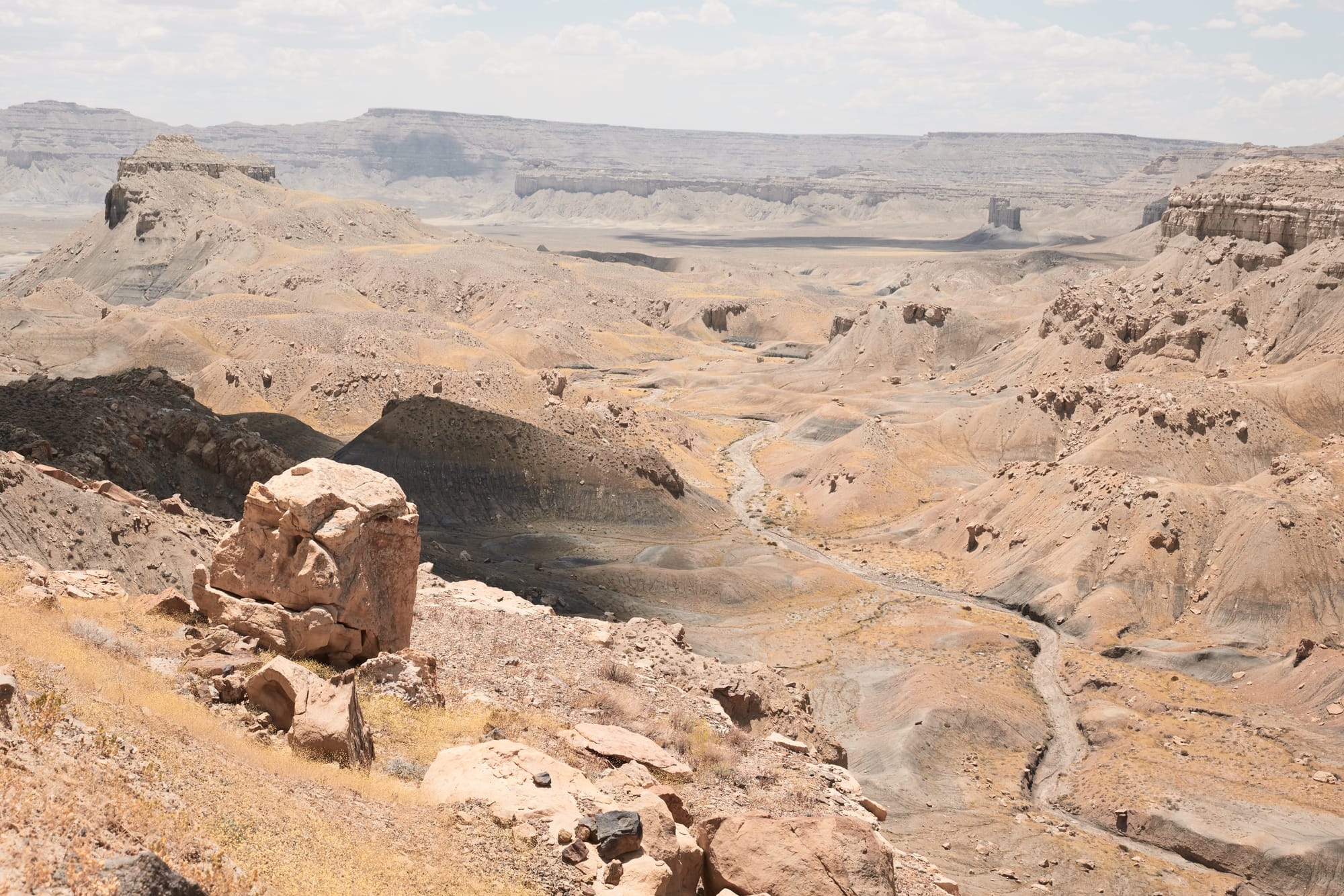 We sleep well, however. Back on the trail we finally climb out of the thorny canyons and the landscape opens in all directions, no sight of roads or towns as far as the eye can see. This is a desolate place, painted in yellows and grays, affording life only to small shrubs and wildflowers speckling the landscape in saturated droplets of color. At the bottom of rolling canyons, we see yellow etch marks crisscrossing every which way where rivers used to flow. It's June now, however, and temperatures north of 100 degrees Fahrenheit are a persistent reminder why we're hauling tens of gallons of drinking water across this parched land. Breaking down without water here is downright dangerous.