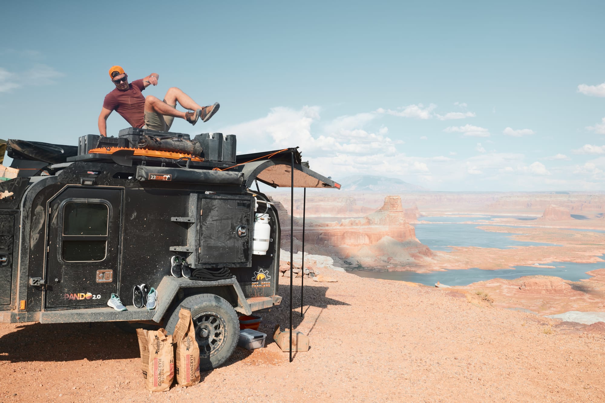 Our destination for today is Alstrom Point, a dispersed camping site perched a thousand feet above Lake Powell and one of the southernmost locations within the state prior to crossing over to Arizona. We've covered a good chunk of trail yesterday and arrive on location with the scorching sun high in the sky and plenty of time to configure camp, hike around the area, and cook ourselves a lavish meal. Having spent just a few minutes outside the air-conditioned cabins we make a wise decision to extend as many of the shelters and tents we've brought with us. We manage to untangle the most complicated awning made by man on Martin's trailer – fixed in placed with multiple vertical posts and spider webs of bright red rope that require fancy nautical knots to tie things into place. I swear under my breath as I use overhand knots everywhere… meanwhile Vaidas unpacks his stadium sized tent that he probably bought at Menards. It features a thousand aluminum legs and could serve as shelter for multiple refugee families, but we set it over our dining table to provide shade for our salami, pickles, beers, and ham.
