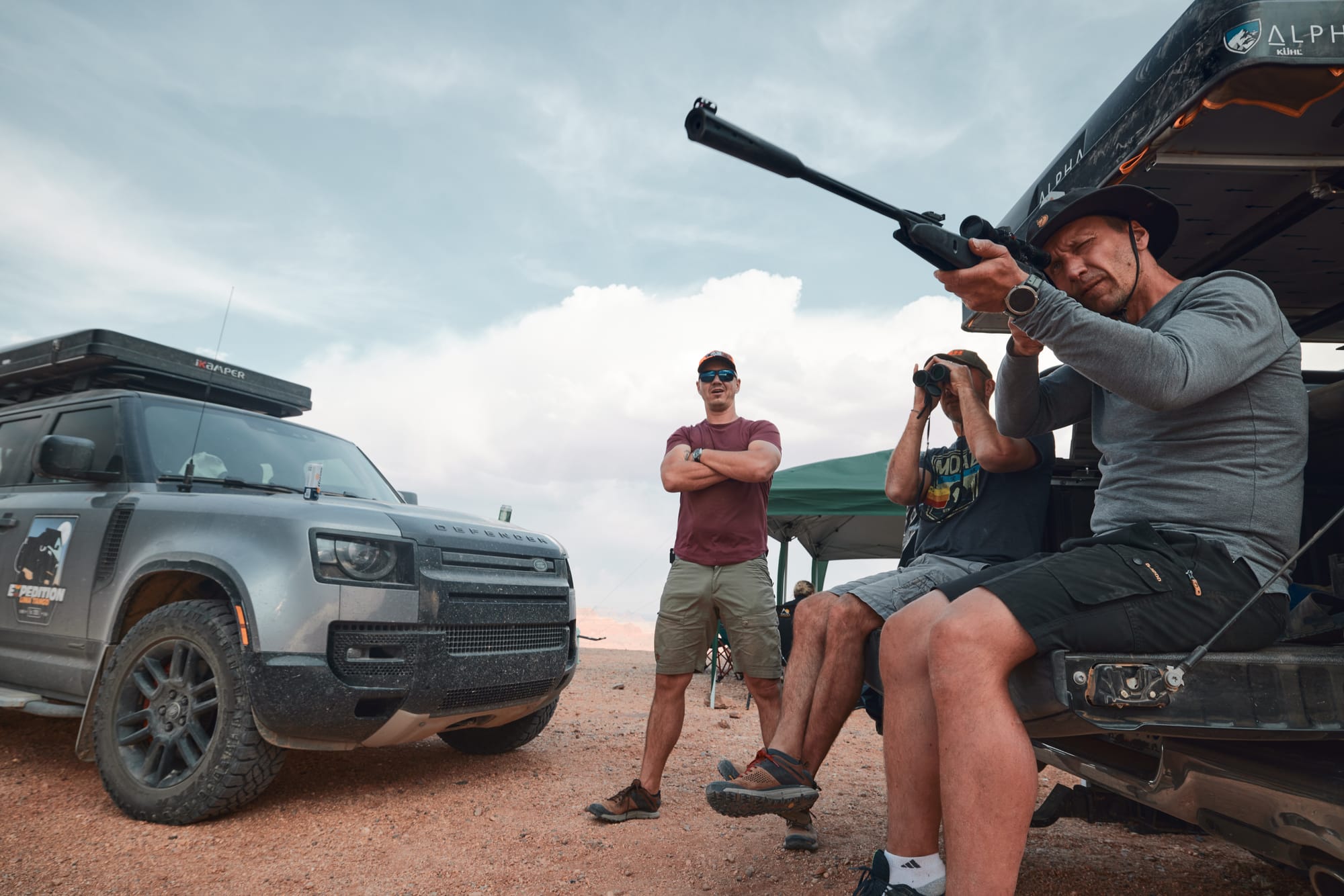 The sky is overcast now and we're grateful for the cooling breeze – we'll miss out on the sunset, but at least the evening will be pleasant. There's a storm brewing on the horizon and I have a flashback to a prior trip with Dominic where we thought the gale would rip our tents off the trucks, but surely that's not the case for today. Summoning the advanced knowledge and tooling of a pilot, Dominic pulls up the meteorological radar on his phone and declares that the storm is indeed moving in parallel to our current location and that there's "less than 5% chance that the edge clips our camp". A bet is wagered on said prediction.