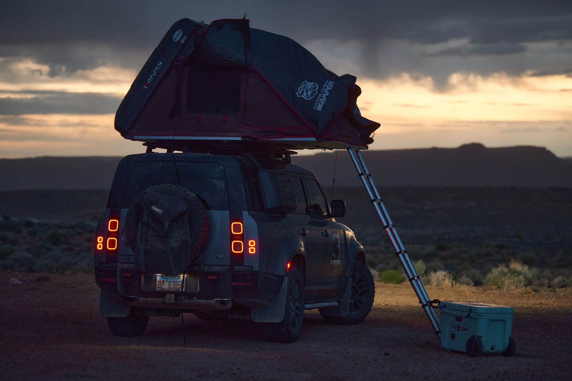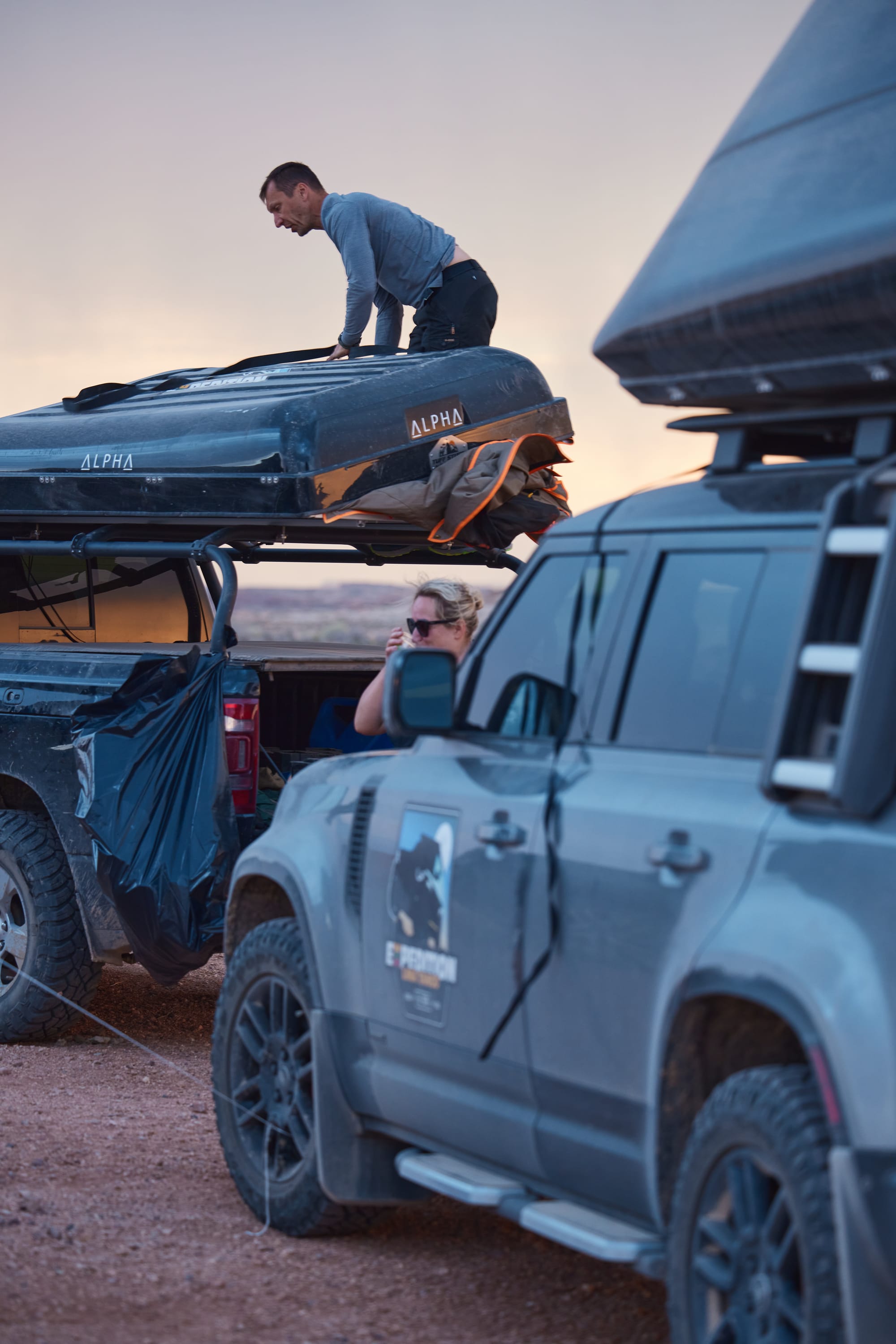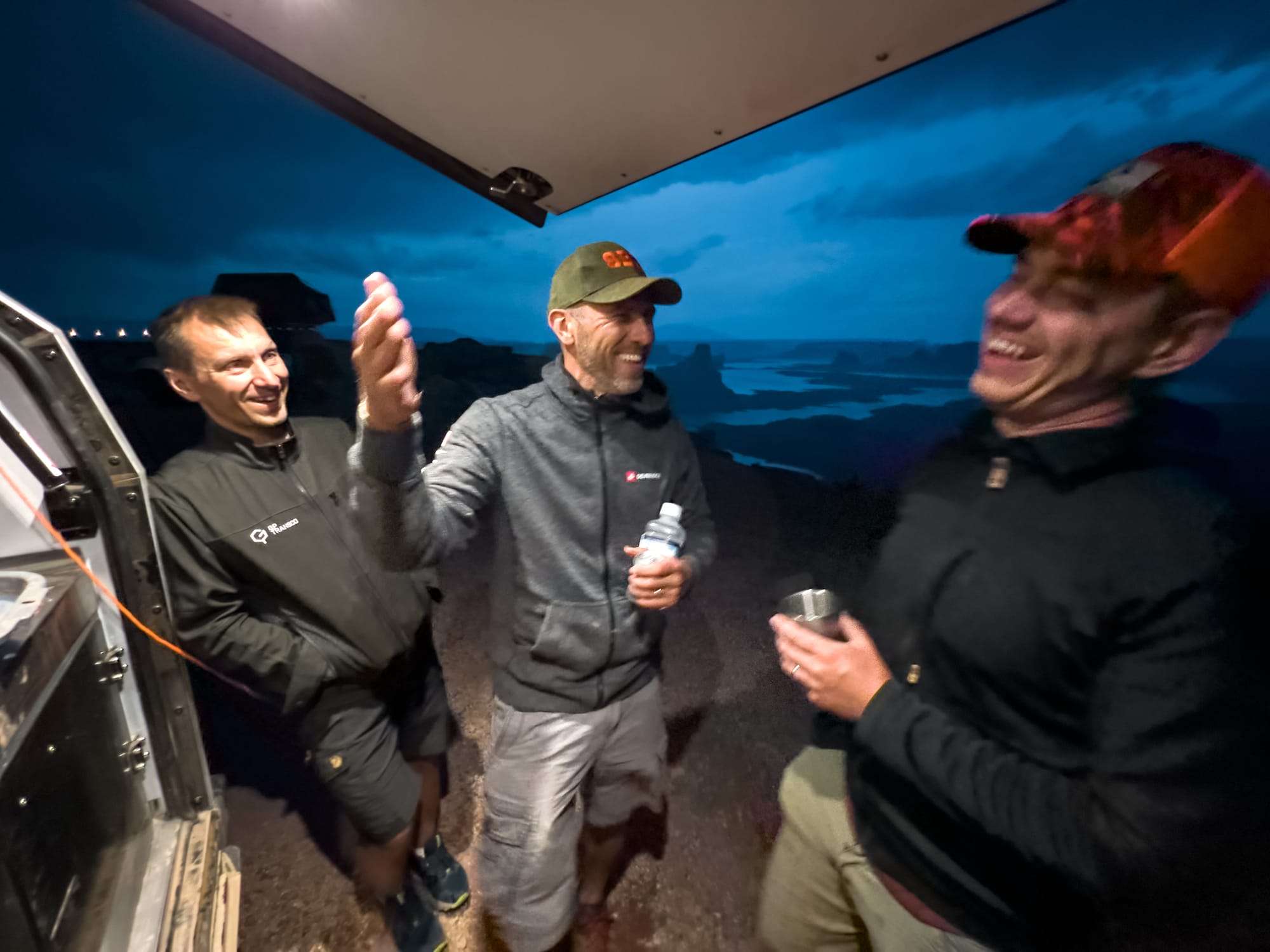 We feel humidity in the air, then feel a few drops of rain. Then it starts pouring, horizontally. We had positioned our vehicles to face the canyon for romantic views upon sunrise, but that also means that a couple of the trucks have tent openings facing directly into the rain. Martin opens the metal back of the trailer for shelter while there's a mad scramble within the camp to reorient the Defenders, collapse tents, and salvage loose items that continue their crawl towards the abyss. Rain is everywhere, the wind kicks it around corners, and I'm happy I'm wearing my Arc'teryx shell. Someone recalls Dominic's weather predictions and comments on lesser likelihood of flying together in the future. Throughout torrential rain, chaos, and wind a few bottles of libation surface from the depths of Martin's trailer and a glass of whiskey is passed around. A bottle of champagne is dispatched to the vehicle where ladies have found refuge. Bruised, battered, and wet we're less bothered by the storm now, crowding behind the safety of Martin's kiosk and observing the devastating power of nature pour its wrath onto the plateau of the canyon.