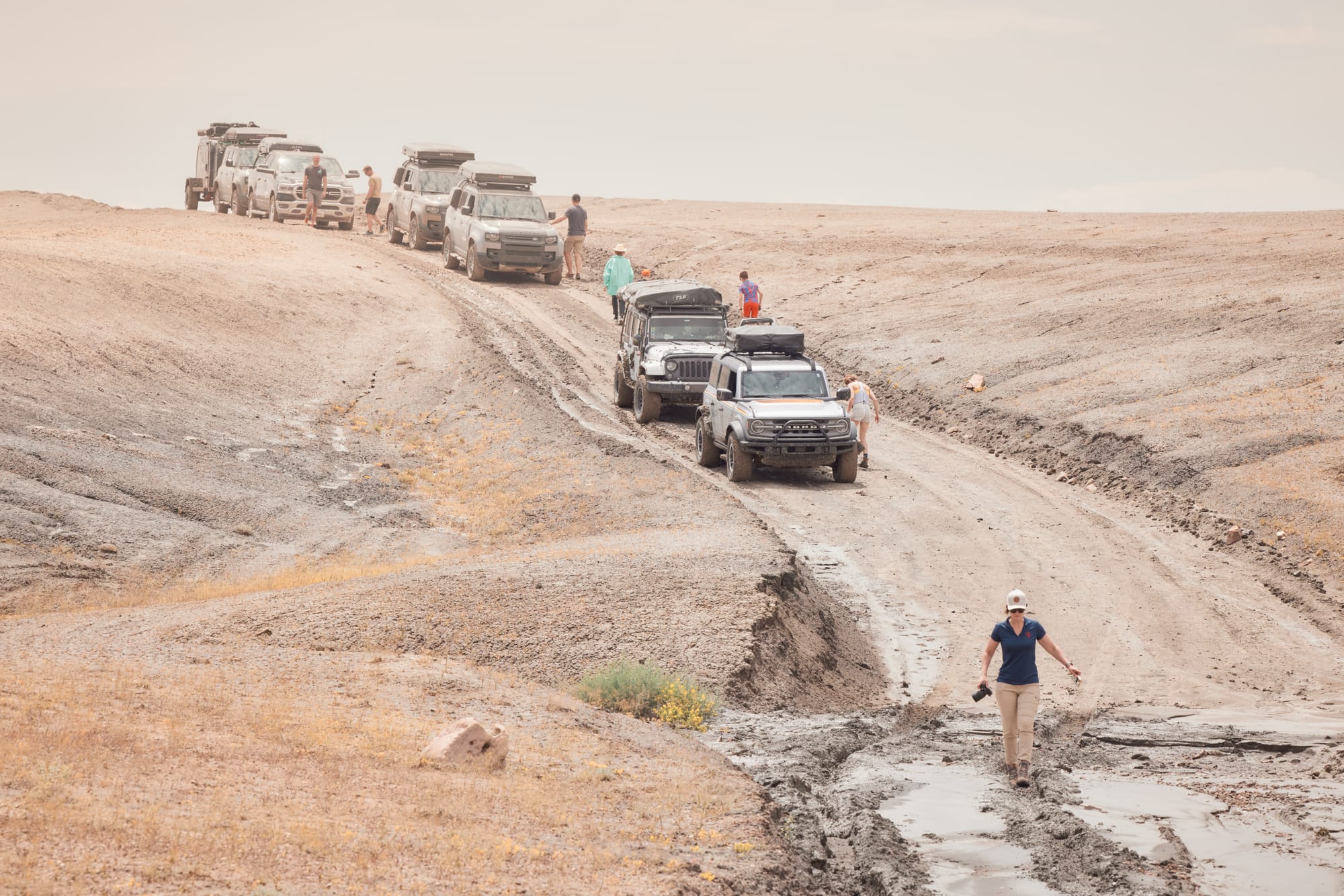 Cresting one of the rolling hills we notice traffic up ahead – a kitted out Jeep Wrangler and a Ford Bronco sit on the side of the trail, the crew scattered around a depression in the road. A young lady is kneeling next to the Bronco and using a shovel to unsuccessfully clean the mud off the wheels, while further down a guy is measuring the depth of a mud rut with his flip flops. We realize that the depression in the road is a runoff area where yesterday's storm must have found the path of least resistance, now filled with, what looks like, a foot of mud. We're slightly confused as to the reluctance of our overlanding brethren to dip into the mud bath, but it is possible they lack needed recovery gear, were things to go sideways.
