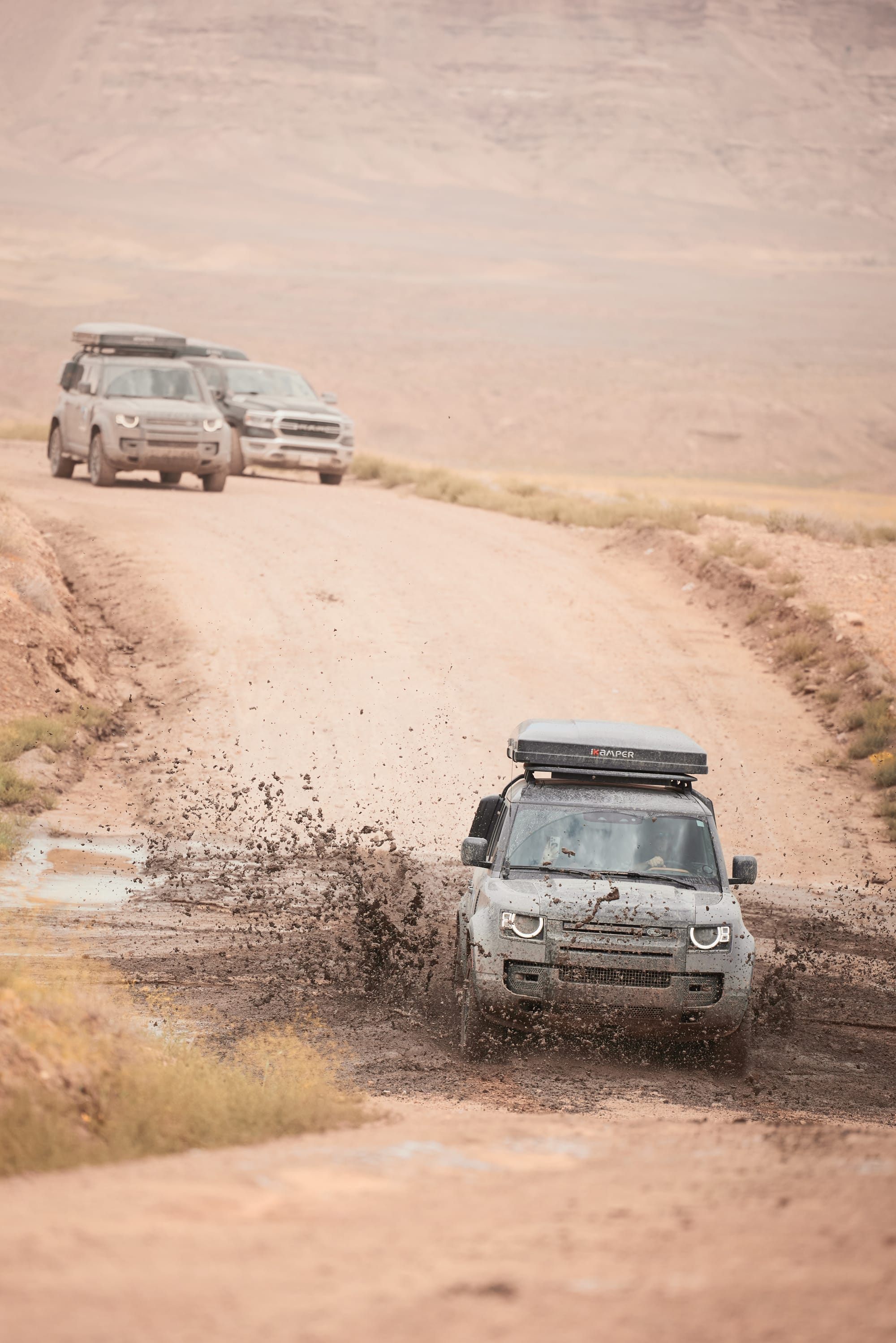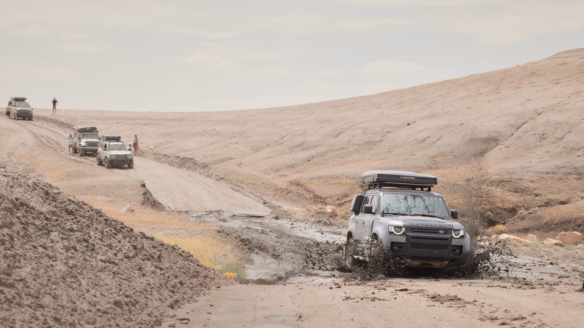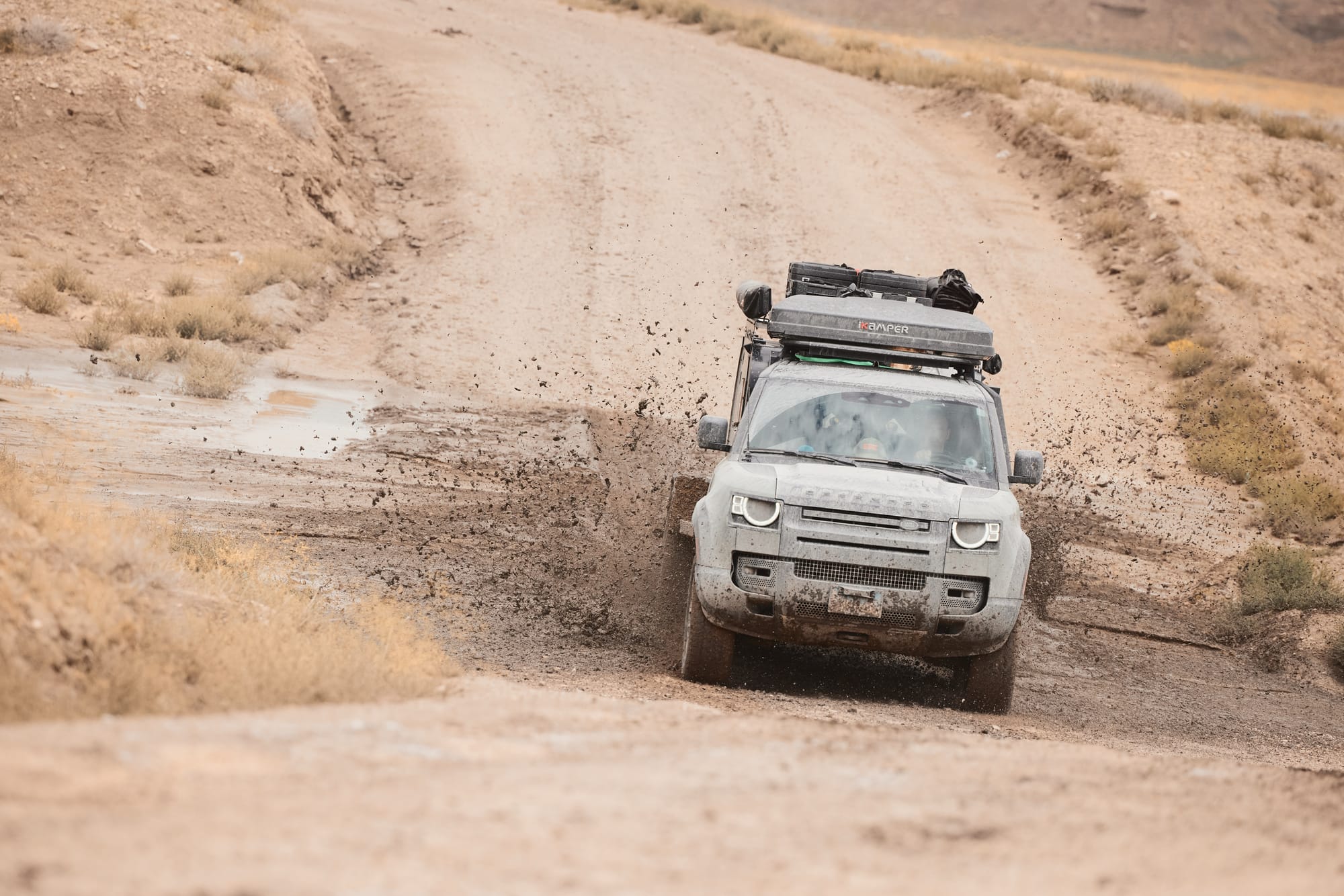 Dominic recommends unloading my passengers and then doing a trial run – if I get stuck, they'll rope the truck and extract me back to the shore. I fondly remember that there's a setting on the traction system for mud ruts, engage the mode, and launch the Defender. One moment I'm debating the amount of momentum to apply while entering the mud, the next there are fountains of liquid earth flying from both sides of the vehicle, the body of the truck oscillating left and right as wheels spin and the Defender swims, rather than drives, on the liquid slop underfoot. I can feel the truck losing momentum as the resistance from the mud fights what little traction exists, but the truck maintains high RPMs and slowly wiggles its way across the puddle, finally clawing onto the dry bank.