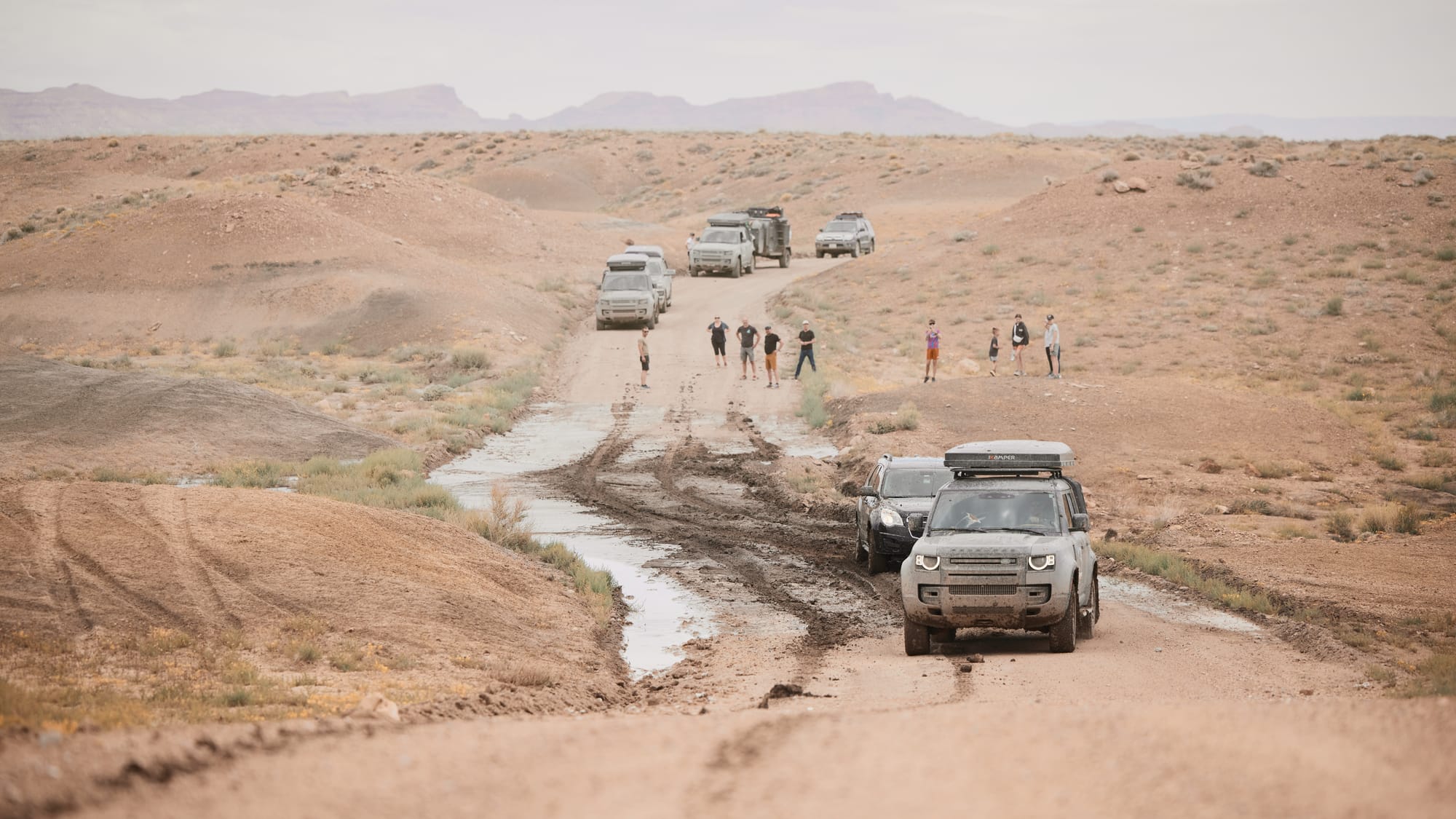 What once used to be a puddle now stands in our way as a brown muddy lake. Lower temperatures across Utah and spring rains have changed the landscape from the last few times we traveled here. Dominic dispatches one truck at a time to test the soft bank of the lake and make sure we can traverse to the other side. We do have tow ropes, but they're useless if multiple vehicles are beached. The crossing is successful, and we rumble along for a few more hours, deeper and deeper into Dark Canyon Wilderness in search of our landing strip.