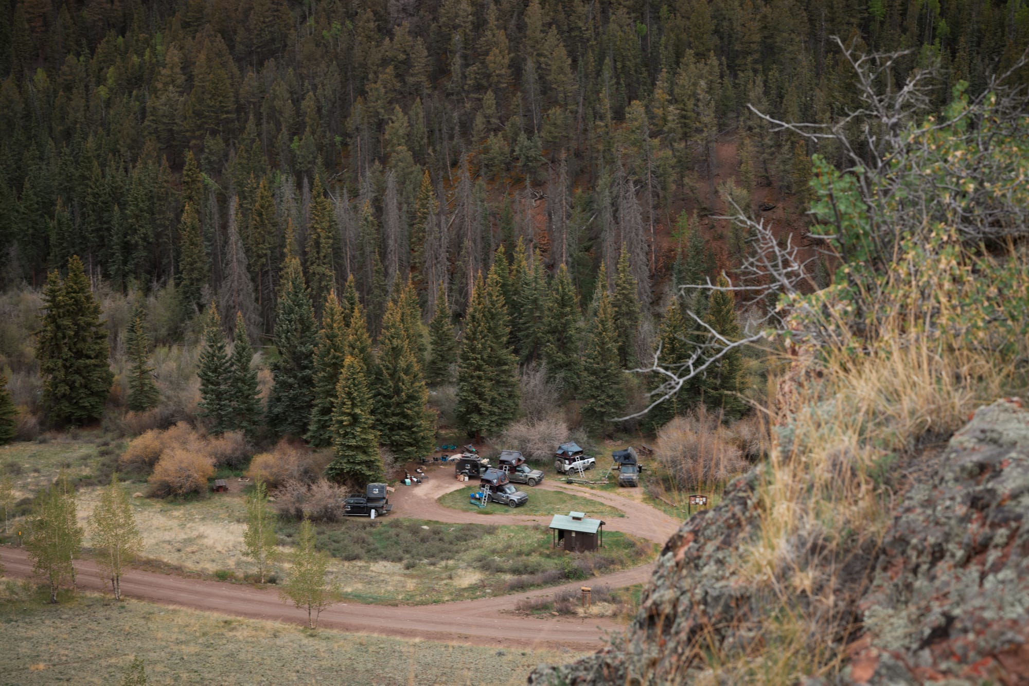 Tired, hungry, and frustrated we backtrack to an alternative exit route from the pass and floor it to the nearest town of Ouray. The radio is silent, the sun is setting behind the mountains, and we're nowhere near our next camp site. In town, a few Jack and Coke's later the mood improves. We fight against the clock to get on the Rimrocker trail and find our next camp spot. The sky shifts in hues from the orange of sunset to light blues, to inky satin and we're still grinding the gravel trail, covered in dust and illuminated in eerie light coming from our headlights. The trucks need to keep their distance as the dust annihilates our visibility. As the last rays of daylight melt on the horizon, we arrive at a forest camp site that is still covered by winter snow. Even the fierce fire struggles to warm our weary bones on this chilly night and we quickly pack into our tents and call it a day.